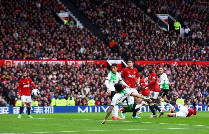 Diaz scorer etter corner. Corneren blir stusset videre av Nunez, og Diaz er helt alene på bakre stolpe. Dårlig markering av United!