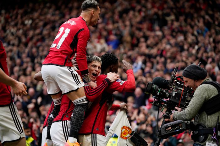 Mainoo feirer med Garnacho og Antony. Foto: AP
