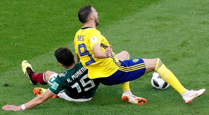 Frispark til Mexico. Duell mellom Sebastian Larsson og Hirving Lozano som ender med at sistnevnte stemples av førstnevnte.