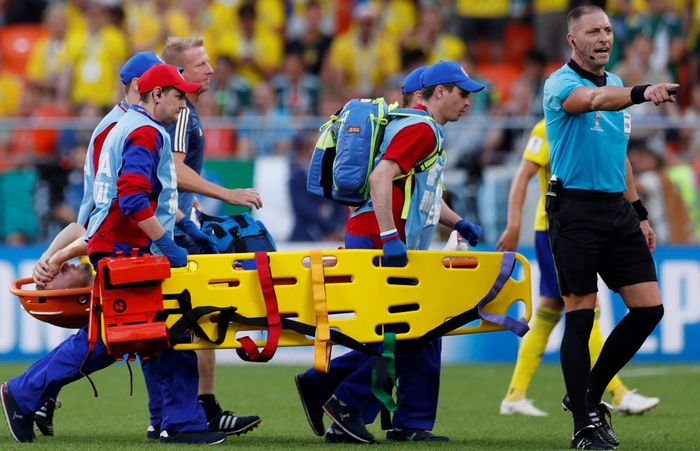 Oi, hva skjer her? Sebastian larsson har fått behandling en god stund nå, og må forlate banen på båre! Nei og nei.. Vet ikke helt hva som skjedde med Larsson der. Tok plutselig telling i midtsirkelen.