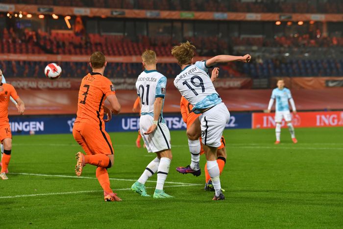 Lang ball fra Strandberg til Sørloth. Men bruker fysikken litt for mye mot van Dijk. Frispark Nederland.