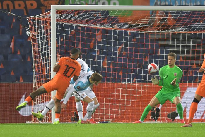 Nederland trykker på. Wijnaldum legger inn til Depay. Headingen i fanget på Nyland. Kampen største sjanse til nå. Norge lever farlig. Foto: Bjørn S. Delebekk, VG