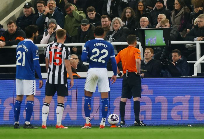 Newcastle har et frispark til høyre på Evertons halvdel og den tas kjapt på Isak som spiller en pasning inn foran mål mot Dan Burn som setter ballen i mål, men VAR viser at Isak er noen centimeter i offside når han mottar ballen fra frisparket.