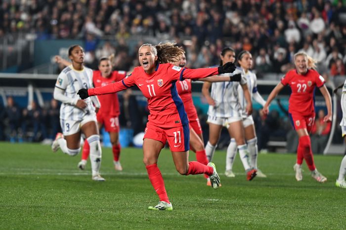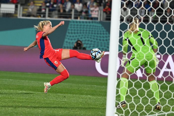 HUN GJØR DET IGJEN! Ny, glimrende scoring av spissen og Norge! Vilde Bøe Risa slår et perfekt innlegg på bakerste stolpe, hvor Romàn Haug igjen er plassert. Med en perfekt heading over McDaniel i buret scorer hun sitt andre og sender Norge opp i 2-0! Foto: Bjørn S. Delebekk / VG