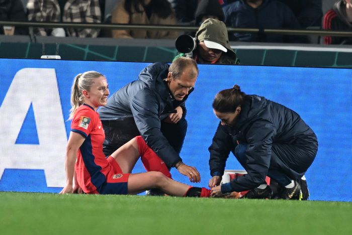 Norges stjernespiss Ada Hegerberg ble ikke klar til å starte den avgjørende kampen. 28-åringen forlot banen rett før kampstart mot Sveits tidligere i uken med en kjenning i lysken, og lørdag meddelte hun at hun ikke ble klar til dagens kamp. Foto: Bjørn S. Delebekk / VG