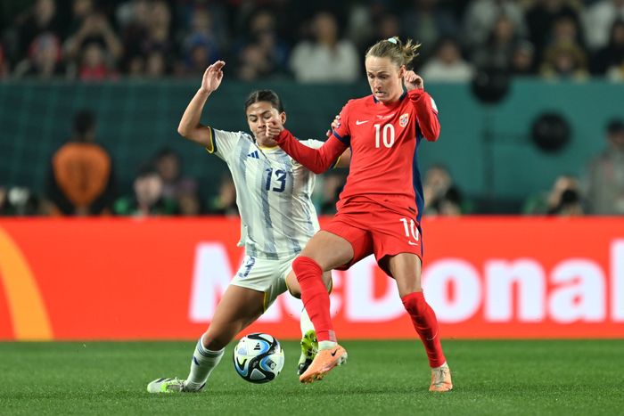 McDaniel slår en lang ball mot Norges 16-meter, før Filippinene får et hjørnespark.