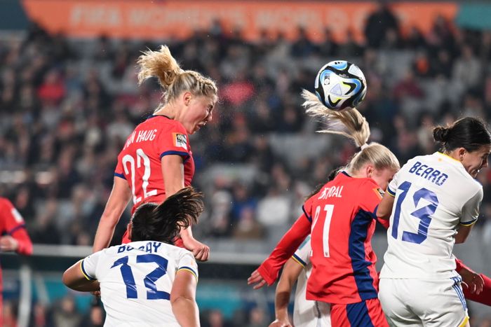 Nesten hat-trick! Romàn Haug vinner alt av dueller i dag. Her vinner hun en hodeduell i feltet, men får ikke headingen langt nok til side for keeper. Norge fortsetter å produsere sjanser!