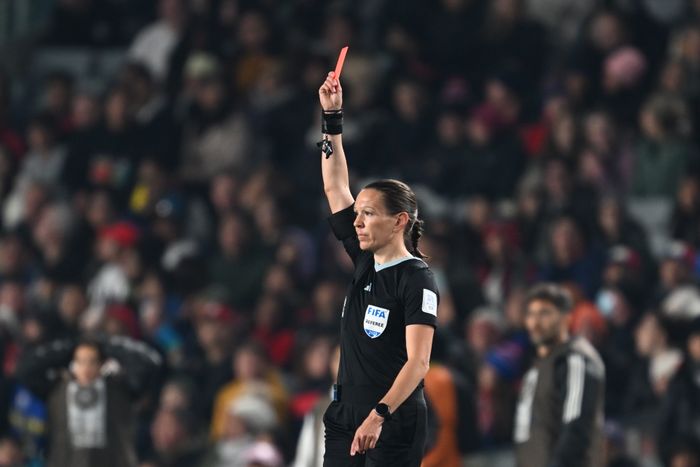 Harrison får ikke fortsette. Etter VAR-sjekken blir innbytteren vist ut! Foto: Bjørn S. Delebekk / VG