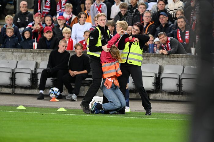 Nesten at Haaland vinner ballen og er alene med keeper. Dessverre blir spretten litt lei, og han får ikke kontroll på ballen.