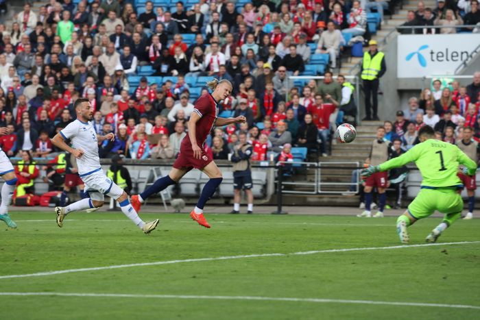 Haaland setter sitt andre for kvelden og avslutter et nytt herlig angrep fra Norge. Dønnum spiller Nusa fri som har en banehalvdel å boltre seg på. Med perfekt timing slipper Nusa gjennom til Haaland som kommer stormende mellom Kosovos to stoppere. Manchester City-spissen banker ballen enkelt forbi Bekaj.