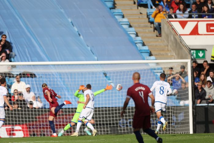 Kosovo spiller seg frem til en god mulighet, men Nyland har god kontroll på skuddforsøket selv om ballen endrer retning.