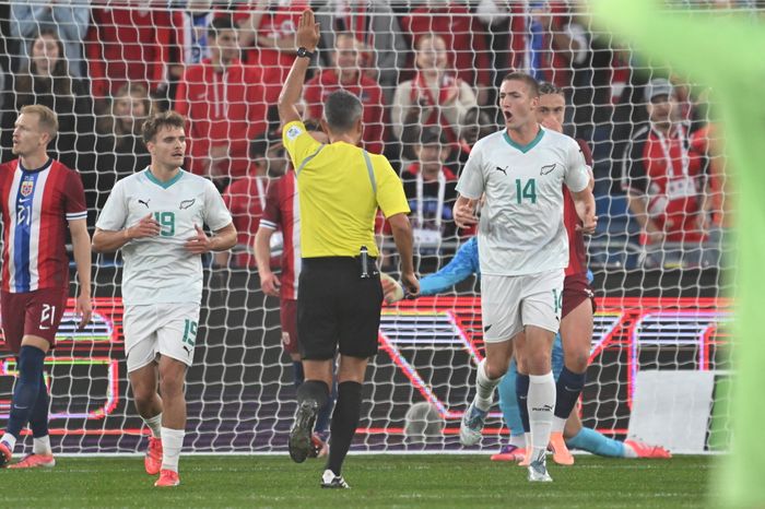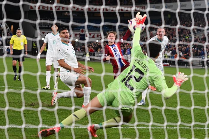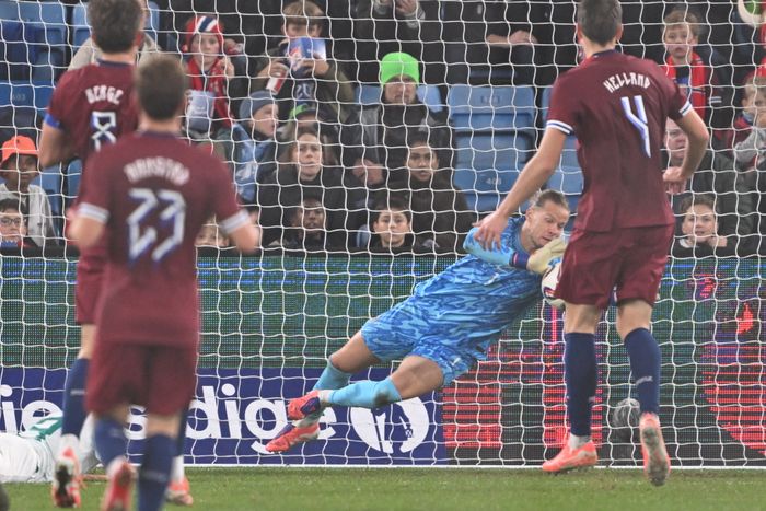 New Zealand og Stamenic får ballen i mål, men dommer blåser for offside. Ballen slås mot Wood, som får headet mot mål. Nyland redder rett ut til Stamenic, som setter den i mål. Stamenic er i offside i det frisparket slås, så han tar fra seg selv målet der.