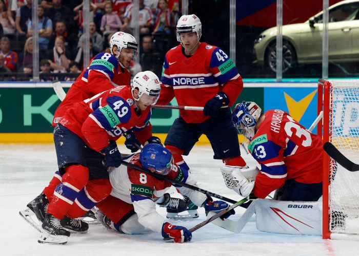 Kaos foran Norges mål! Men Tsjekkia får ikke klemt pucken i nettet.