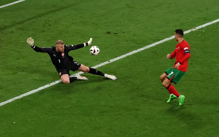 FOR en redning! Ronaldo får en eventyrlig mulighet til å sende Portugal i føringen når han spilles gjennom alene mot mål. Stanek i Tsjekkia-målet er våken, er raskt ute og gjør seg stor. En livsviktig redning han gjør der, sisteskansen.