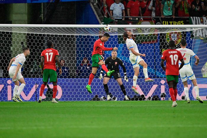 Trusselen Ronaldo fortsetter å bare være "nesten" først på ball. Blir slått i lufta inne i boksen, 39-åringen.