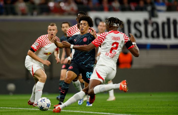 Doku inviterer til vegg med Foden og går i bakken i duell med en Leipzig-forsvarer. Får ikke frispark.