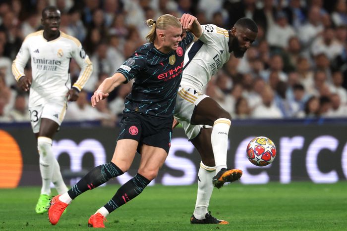 Dias prøver å spille opp til Haaland - men Rüdiger er råsterk og bryter foran jærbuen. Det jubles det for på Santiago Bernabéu.