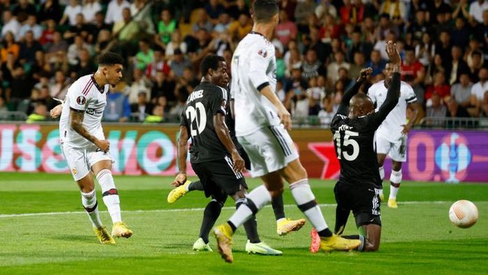 Elanga spiller en fin vegg med Bruno Fernandes, før han er fri i feltet. Der prøver han å spille på tvers, men ballen blokkeres før den går i hånden på en liggende Elanga. Frispark til Sheriff.