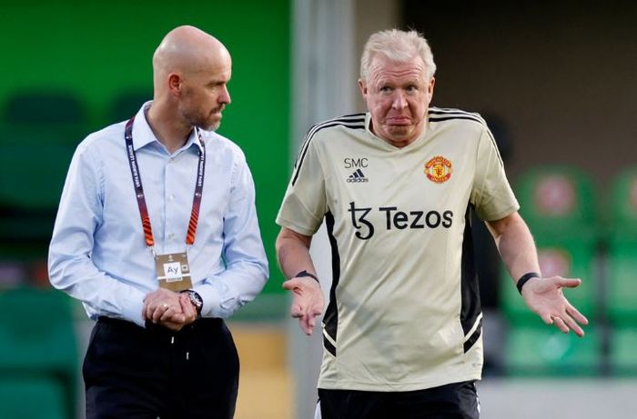 Erik Ten Hag gjør fem endringer etter 1-0-tapet for Real Sociedad i åpningskampen. Her er han sammen med assistenttrener Steve McClaren. Foto: Reuters