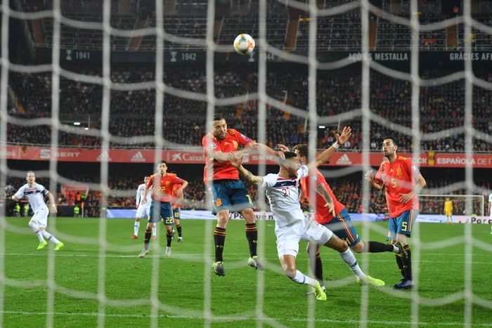 DER SITTER 1-0 FOR SPANIA! Alba sprinter fra Ødegaard på venstresiden og slår inn. Inne i feltet står Rodrigo helt alene og plasserer ballen i mål. (Foto: Bjørn S. Delebekk/VG)