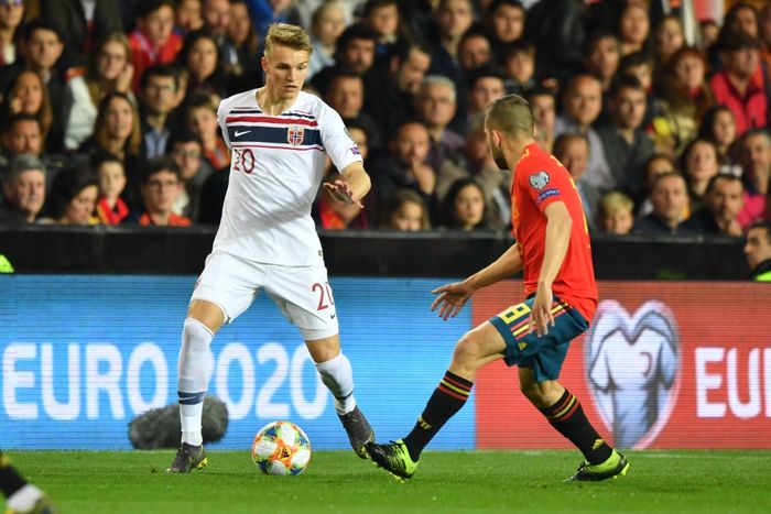 Norge med antydninger til et godt angrep. King og Ødegaard kombinerer, men King slår feil og Spania tar over.