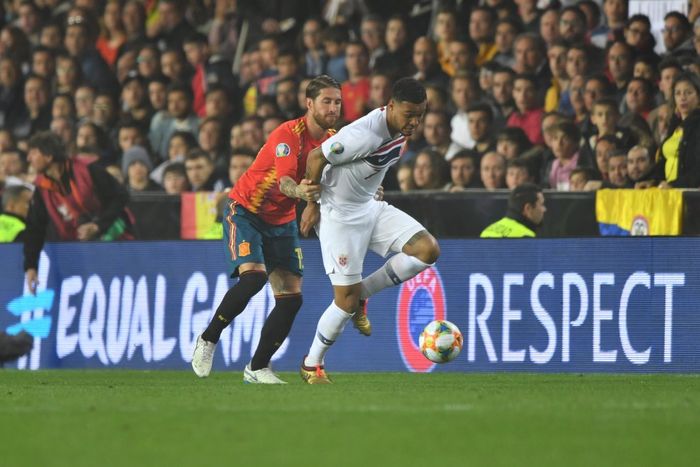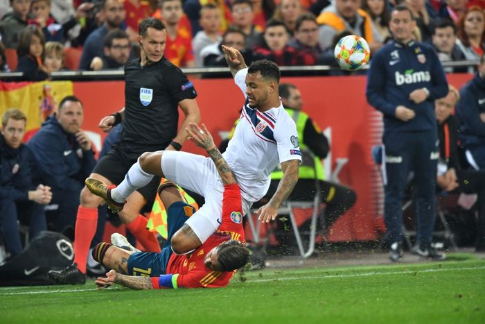 Ramos med en susende takling på King. Norge får et kast på Spanias halvdel. (Foto: Bjørn S. Delebekk)