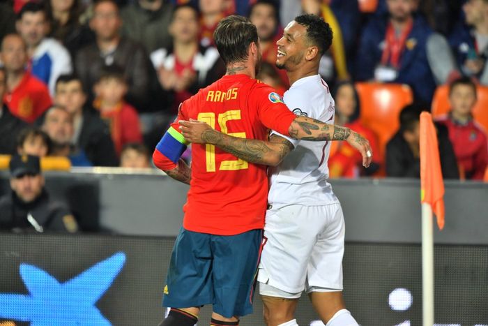 ENORM RAMOS-MISS! Spania tar corneren kjapt. Ceballos får all tid i verden og prikker sin lagkamerat i Real Madrid, men fra kort hold skyter Ramos ballen opp på tribunen. Svak markering igjen. Kaptein Johansen står ved siden av og stryker stopperkjempen på armen.