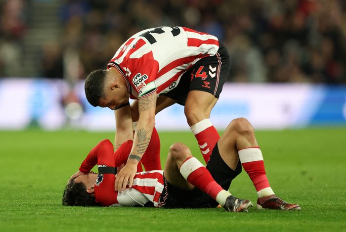Merino blir liggende nede i Sunderland-boksen. Mulig han fikk en albue i bakhodet fra Ballard etter et innlegg fra Trossard.