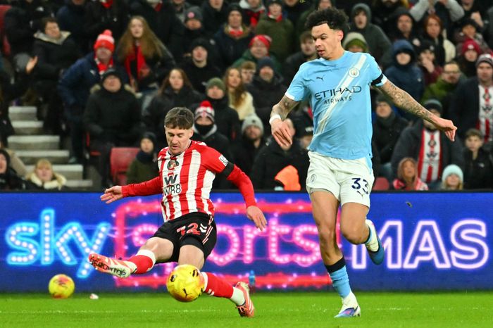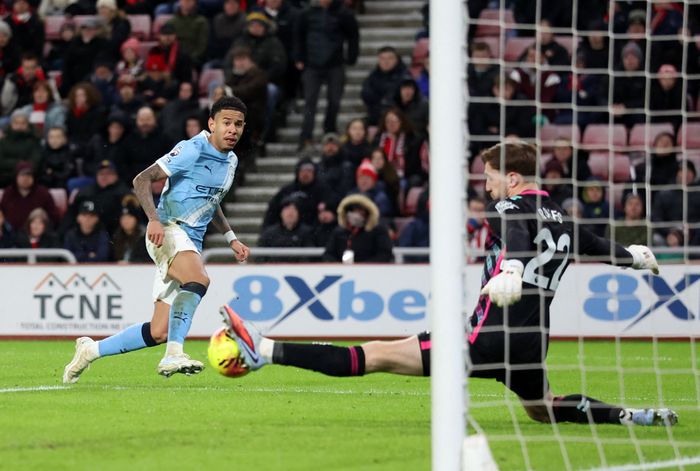 Mayenda vinner ballen utenfor Sunderlands 16-meter. Felles umiddelbart av Gvardiol. Frispark til hjemmelaget.