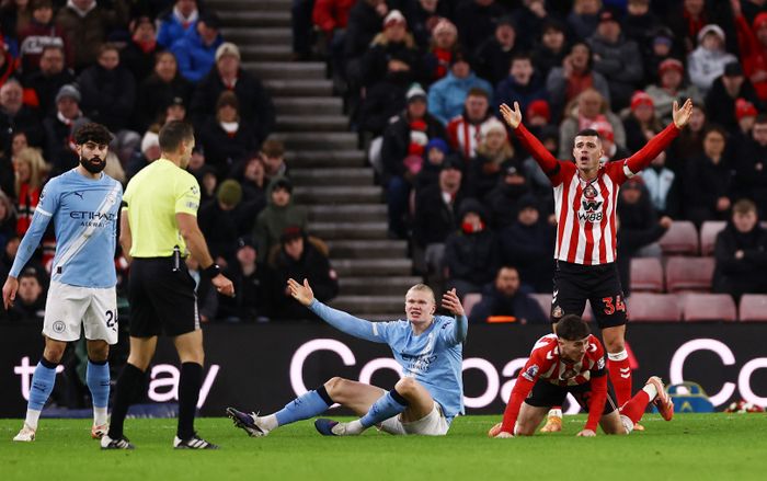 Haaland tydelig misfornøyd med Gilletts dømming. Går og prater med dommeren mens spillet er i gang. Gestikulerer og peker mot Sunderland-stopperen.