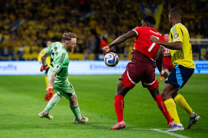 Så får Sveits straffe! Ndoye spiller til Sow som smetter bak ryggen til Bernhardsson. Ser ut til at svensken er uheldig og kommer borti hælen til Sow.