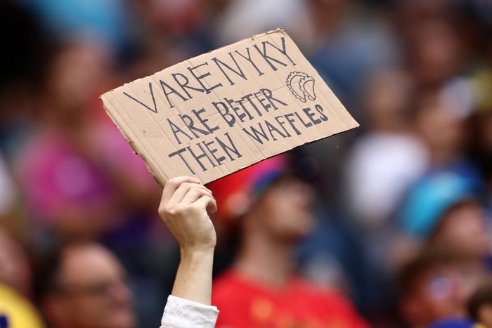 Denne supporteren mener at ukrainske dumplings er bedre enn belgiske vafler. Foto: EPA