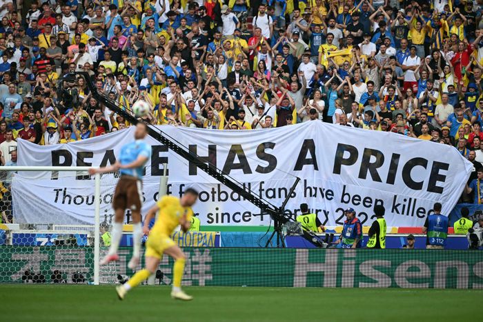 Ukrainske supportere med budskap på tribunen i Stuttgart. Foto: AFP