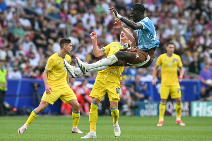 To ukrainske spillere kaster seg ned for å stoppe et skudd fra Doku. Foto: AFP