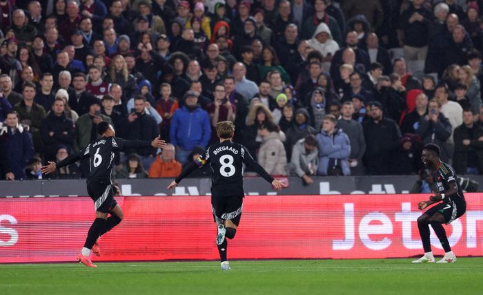 Ødegaard skyter fra 18-19 meter. Fabianski redder den uten problemer, og holder fast.