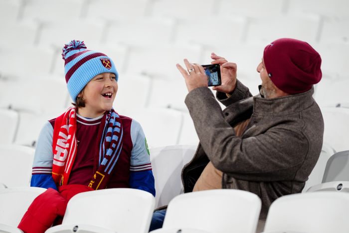 En ung West Ham-supporter koser seg på tribunen, men må nok regne med hets fra enkelte som mener at skjerf med begge lag er en uting.