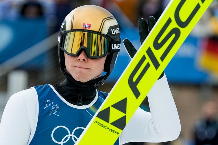 Jens Lurås Oftebro etter hopp i stor bakke tidligere i dag.