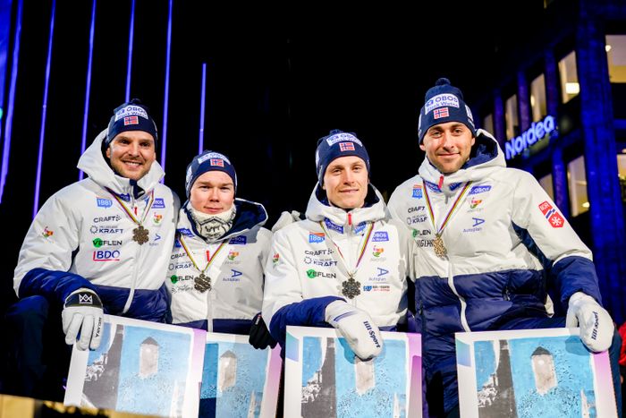 F.v.: Jørgen Graabak, Jens Lurås Oftebro, Simen Tiller og Jarl Magnus Riiber med bronsemedaljene fra kombinert lag fredag.