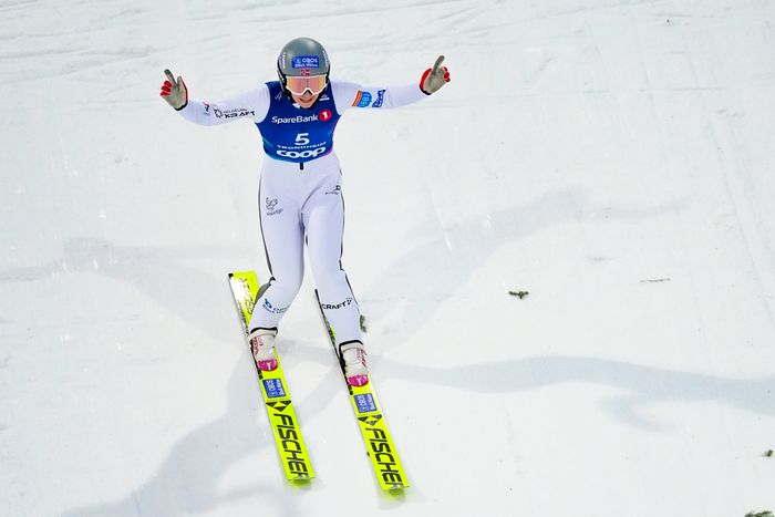 Katharina Gruber tar sats. Fin utgang, men blir ikke mer enn 87.5 meter. Inn på 5. plass.