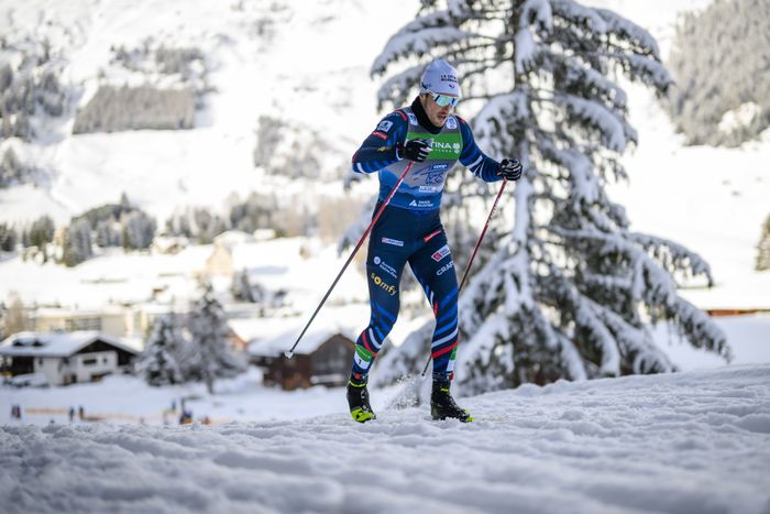 Lucas Chanavat leder torsdagens jaktstart i Davos. Foto: EPA