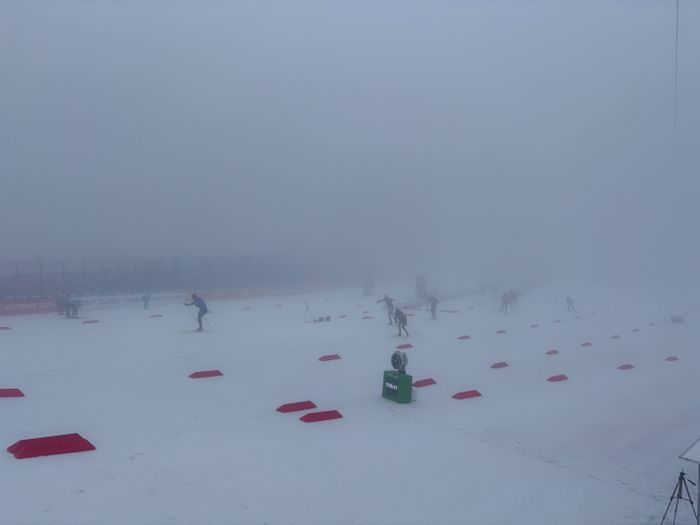Tåkegrøten har senket seg. Hoppbakken ikke å se fra langrennsstadion. Meterologer har pekt på at Holmenkollen er utsatt for tåke fordi det kommer vind med varm, fuktig luft inn fra fjorden. Holmenkollen ligger høyere over havet, og denne vinden blir da kjølt ned og gjort om til en sky i området. Ofte er det tåke i Kollen selv om det er klarvær i andre deler av Oslo.