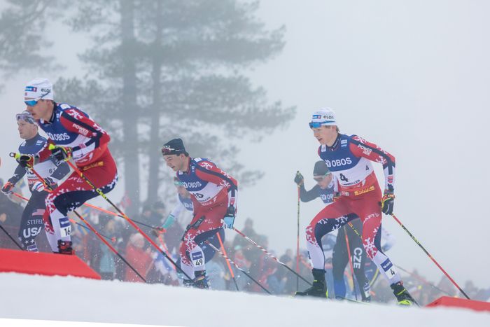 Tildheim Andersen køler på i tet! Skiftet ski på forrige runde og har fått noen sekunder til sveitseren Antonin Savary.