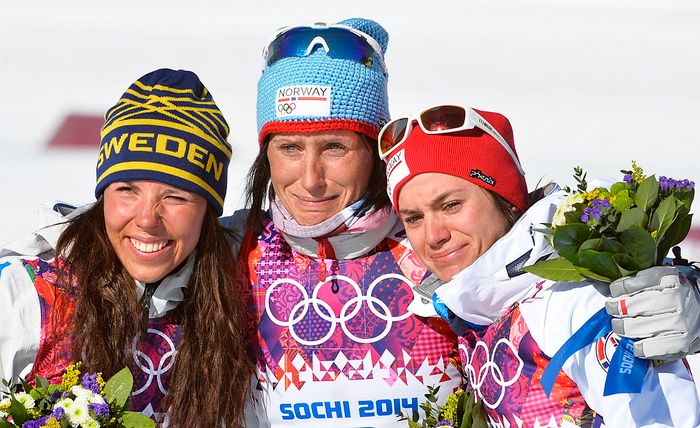 Marit Bjørgen har to OL-gull (2010 og 2014) og ett sølv (2018). Her har hun nettopp tatt gull foran Charlotte Kalla og Heidi Weng i 2014. Foto: Bjørn S. Delebekk / VG.