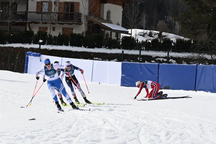 Drama før de har gått 3 km! Både hun og Jessie Diggins går ned i en sving med høy fart.
