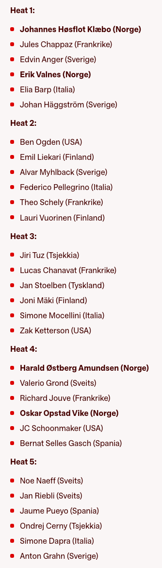 Vi har fått tre kvinner videre til semifinalene med Skistad, Drivenes og Andreassen. Vi håper på fire norske herrer videre.