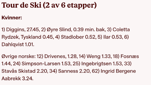 Foreløpig plassering på resterende norske kvinner: Fosnæs inn på 5. plass, Weng nr. 8, Sanness, nr. 17, Aabrekk nr. 35.