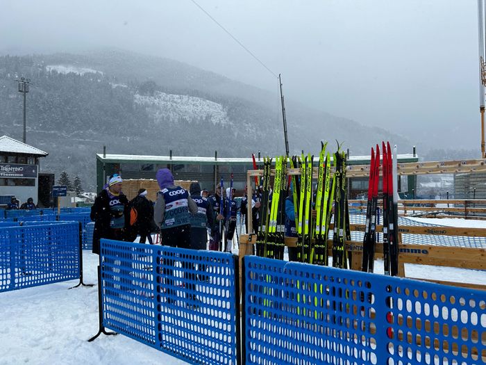 Det er et skikkelig heftig vær i Val di Fiemme i dag. Det er 0 grader og masse snø og sludd. Det blir seige løyper.