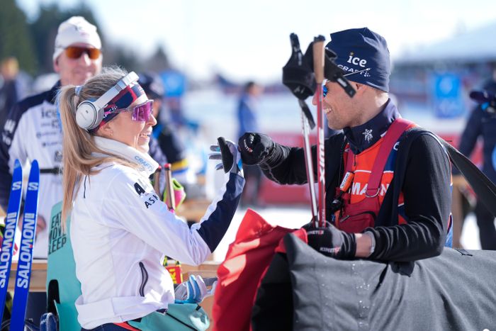 Det er strålende sol og 8 grader i luften i Nove Mesto. Publikum har møtt opp i hopetall også i dag! Rett og slett nydelige rammer for skiskyting. Her er Tandrevold i samtale med smøresjef Tobias Dahl Fenre. Foto: NTB.