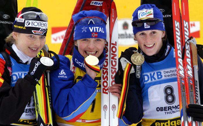Norge er mestvinnende nasjon på øvelsen med 5 gull. Liv Grete Skjeldbreid og Magdalena Neuner er mestvinnende utøvere med 2 gull hver. Foto: NTB.