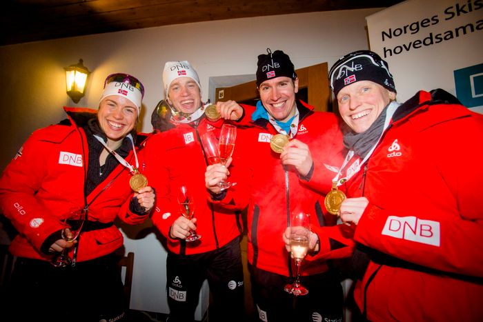 Norge er regjerende mestere. Faktisk har Norge vunnet fire gull på rad i VM på miksstafett. Johannes Thingnes Bø og Marte Olsbu Røiseland har vært med på alle disse, og er mestvinnende med fire gull hver.